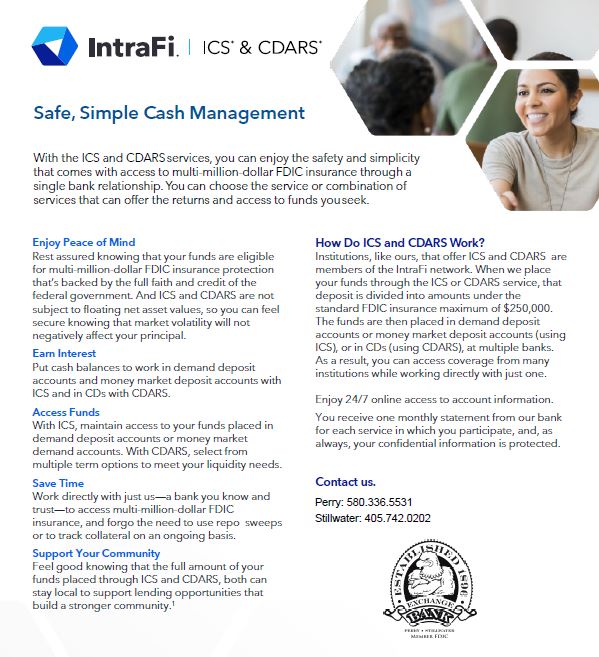 Exchange Bank offers ICS & CDARS products through IntraFi, a financial services company. IntraFi’s tested, trusted services each offer value-added benefits. Whether you prioritize protection for large cash balances, smart returns, a variety of liquidity choices, a reduction of collateralization burdens, or a combination of these benefits, Exchange Bank and IntraFi can help. Call us today to get the process started! We are ready to help!